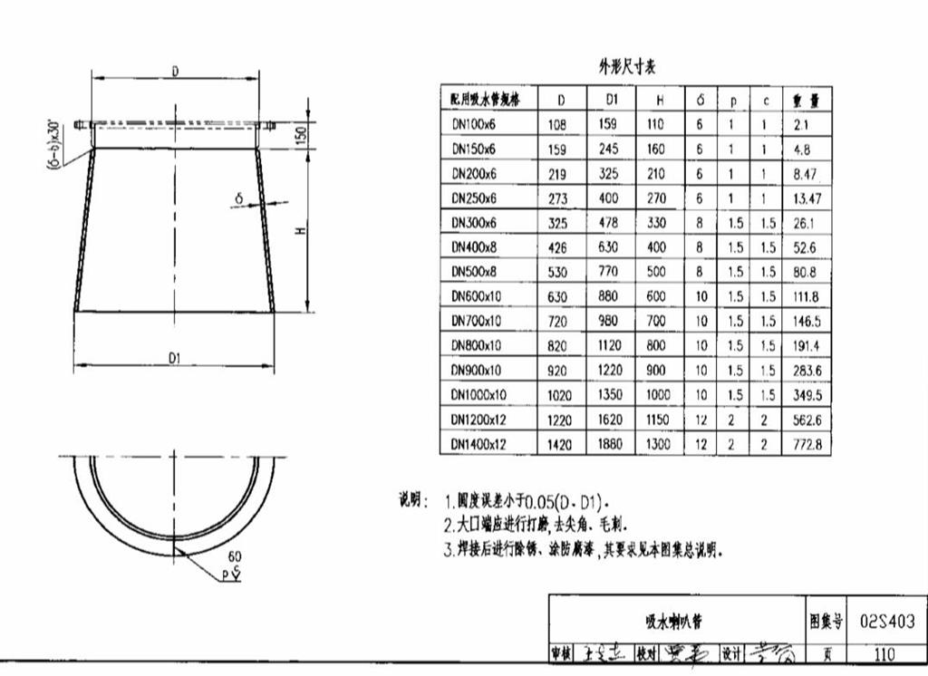 比如說60度45度,再往下呢就是有一個90度鍵縮異徑彎頭尺寸的,跟上面的東西都一樣的一個圖表,反正他這些別管三通也好還是說偏心異徑管等等的也好,基本上都是按照這個意思來的,后是吸水喇叭口吸水,喇叭口在他的112頁,然后我們再說他這個總說明是什么意思就是說這個圖集是根據(jù)建設(shè)`部1999年的202號的文件,并且在1975年編制的S311鋼制管道零件這樣的一個圖集上,這樣的一個基礎(chǔ)上修整完成的,這就是說這個鋼制管件它的一個前身的基礎(chǔ)是什么?